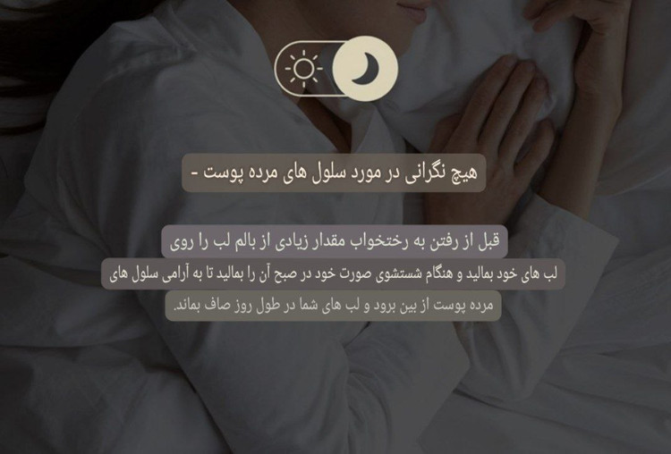 شبها مقدار مناسبی از ماسک شب رو بزنید و صبح روز بعد کمی لبها را آب بزنید و با انگشت ماساژ دهید تا سلولهای مرده و پوسته ها از بین برود و سپس بالم روز را بزنید